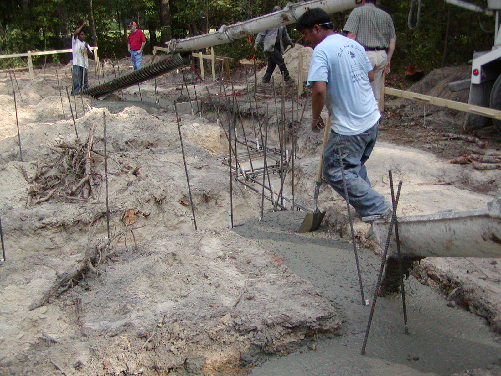 August 2, 2007 -- The far footers require extensions on the concrete truck. With some houses, the truck can drive to each side. Campbell's lot is very wooded and that is not possible. | ![]() |