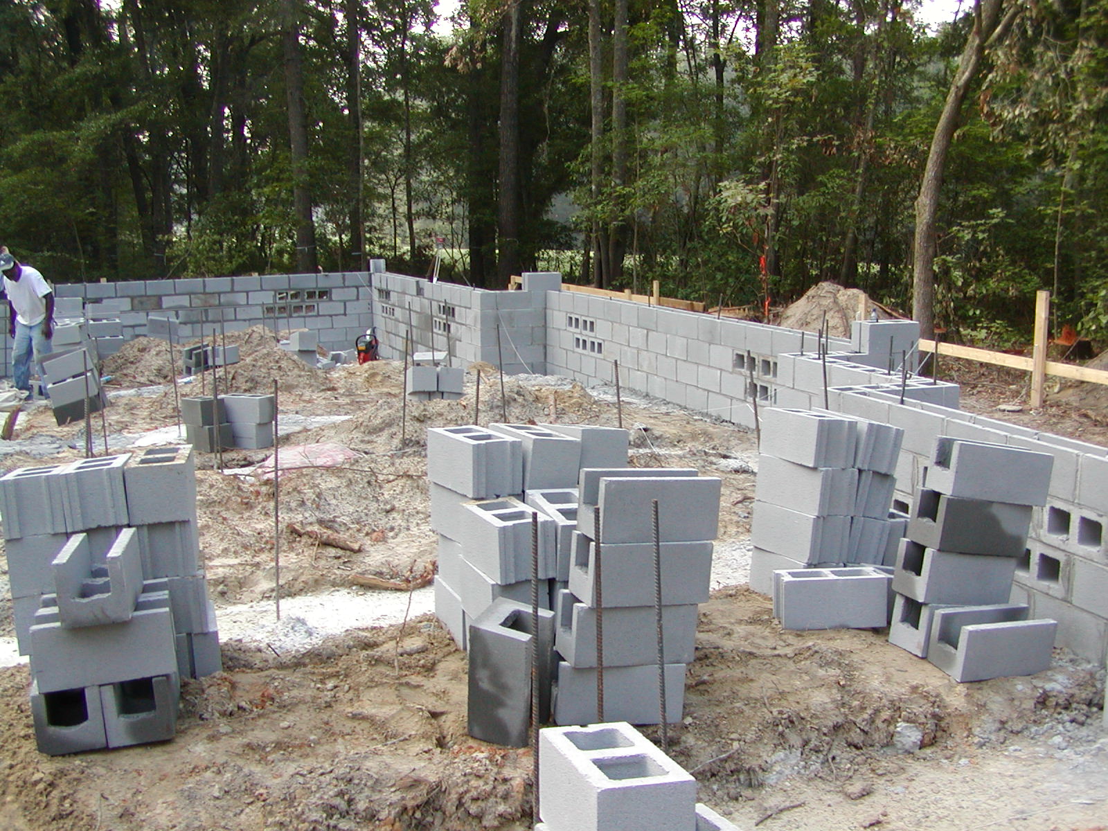 August 7, 2007 -- The block walls are going up. At various places around the curtain wall, blocks are turned sideways for venting. | ![]() |