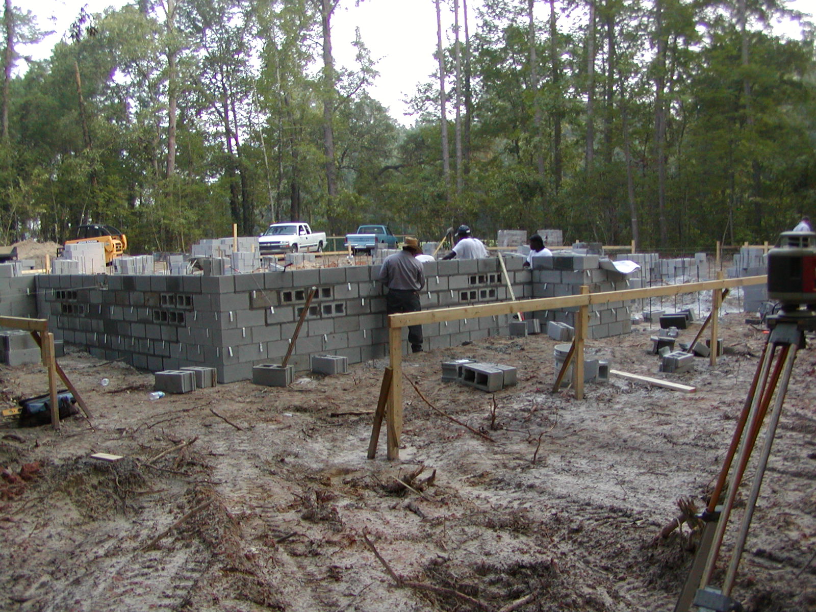 August 7, 2007 -- This is the rear view of the home. Note the laser transom on the right edge of the photo. This helps the masons keep the foundation level. | ![]() |