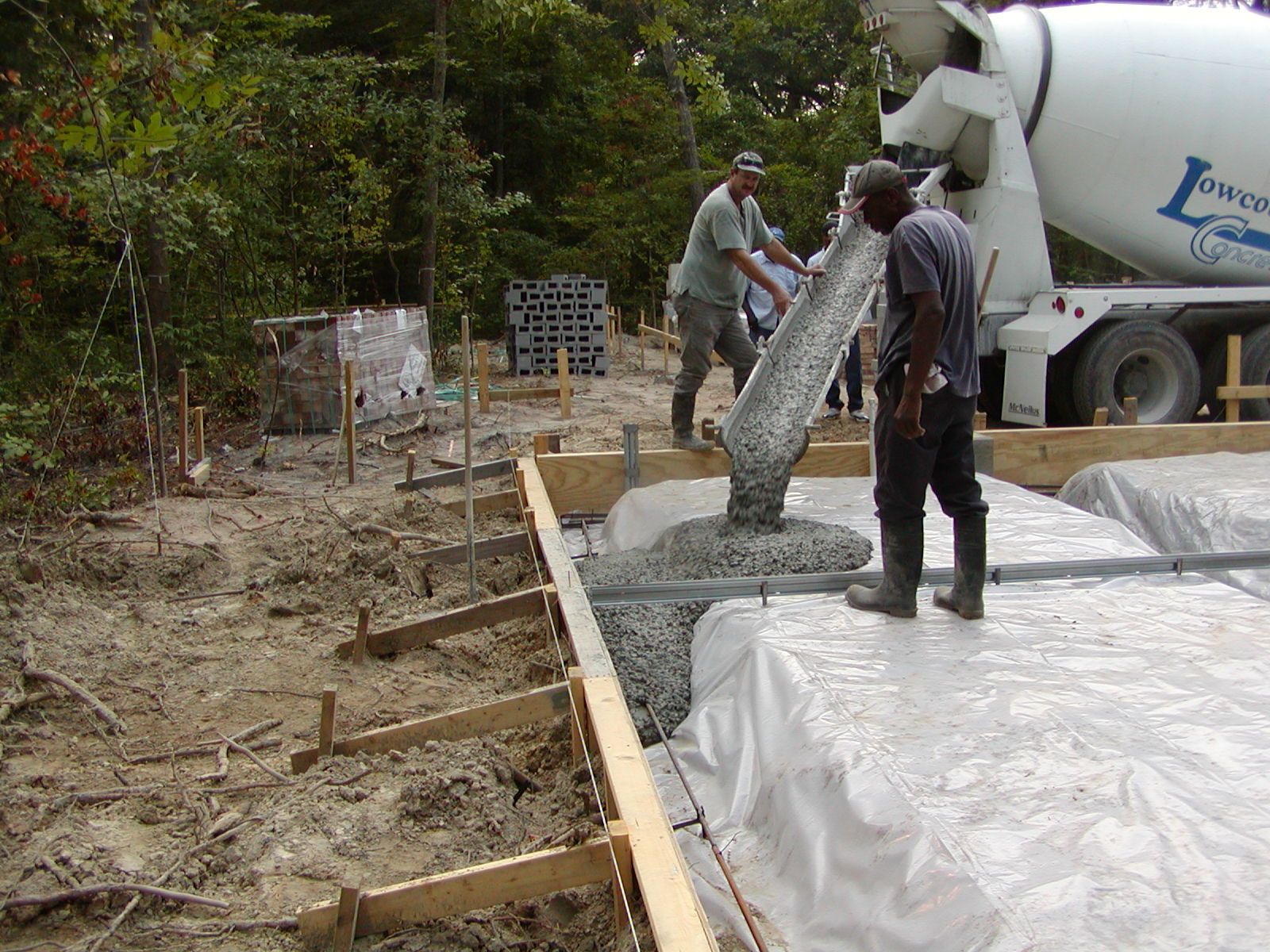 August 17, 2007 -- The garage slab is being poured. The line from the center to the right edge is a keyway, a control joint. | ![]() |