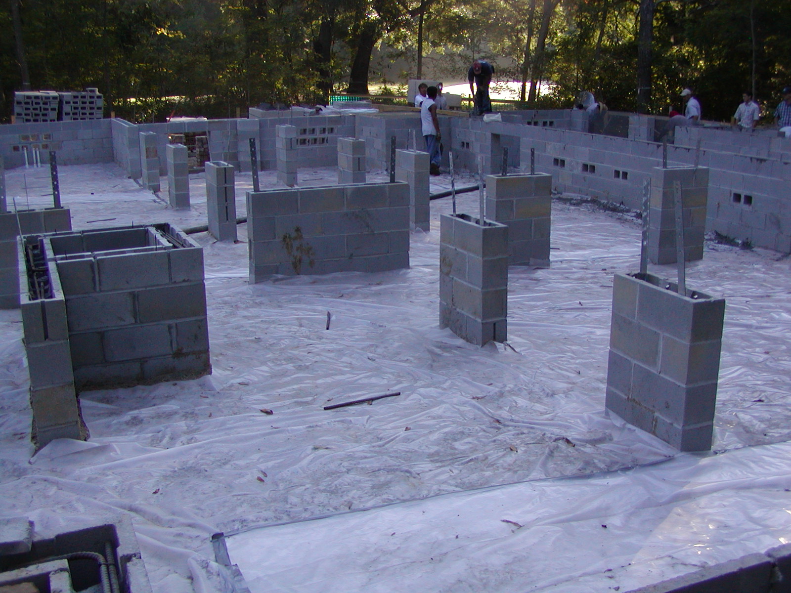 August 20, 2007 -- Plastic is in place and taped in preparation for pouring the dust cap. It will be done as the concrete hose is worked towards the front of the house. | ![]() |