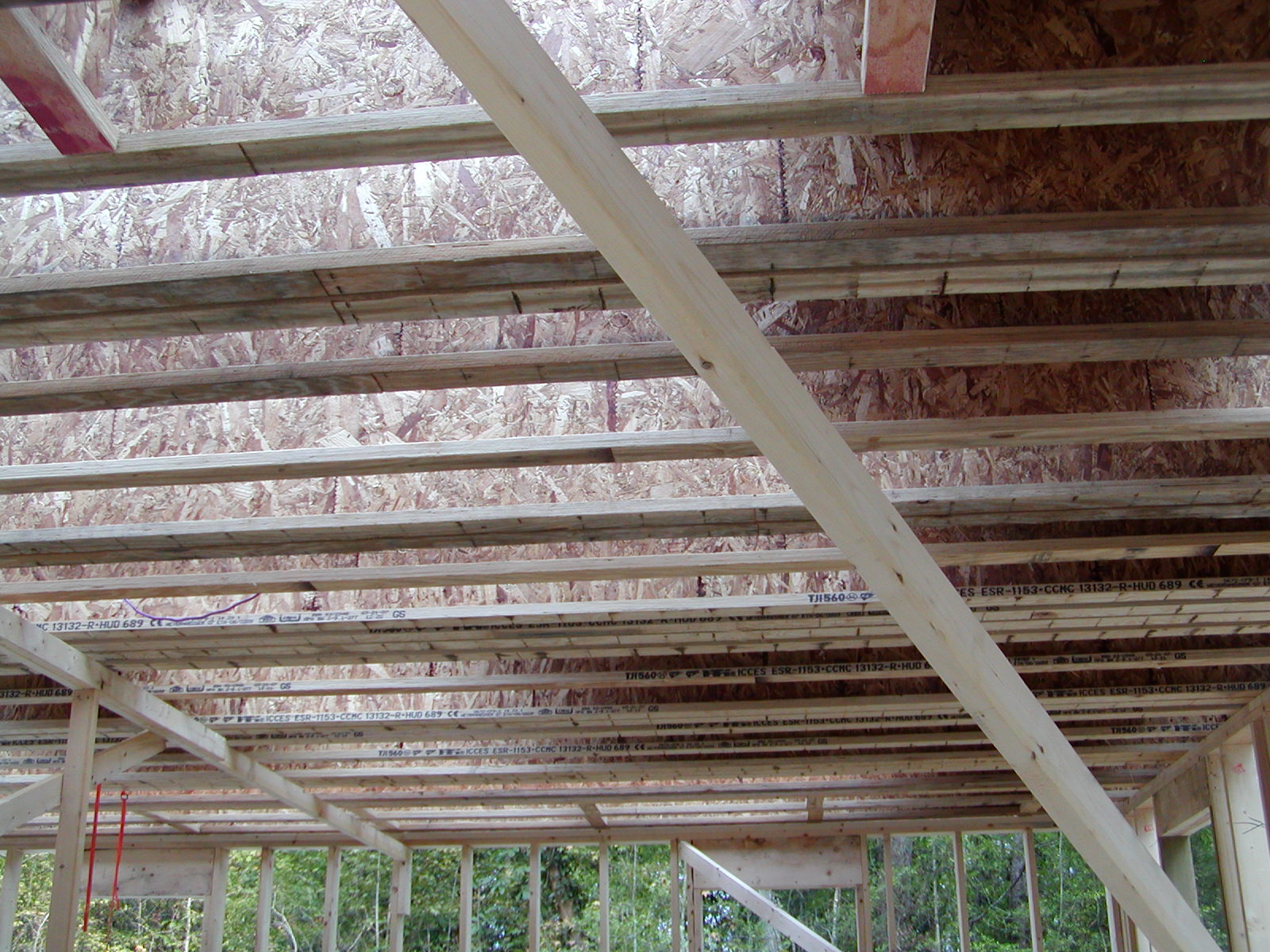 August 30, 2007 -- The garage second floor joists are in place and the second floor sub floor is being installed. The joists close together support the dormers and a wall upstairs. | ![]() |