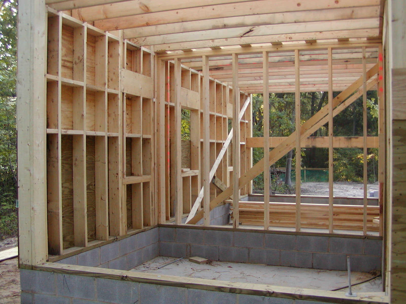 September 5, 2007 -- The close room is a storage room. The far room is a workshop. The rooms still have a lot of temporary bracing that will be removed when the sheathing is completed. | ![]() |