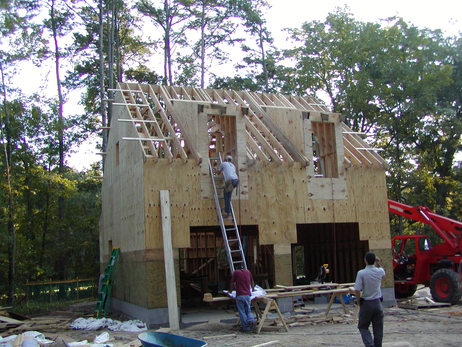 September 12, 2007 -- The garage is shaping up. You can see lookouts on the edge of the roof to support the overhangs at the gable ends. | ![]() |