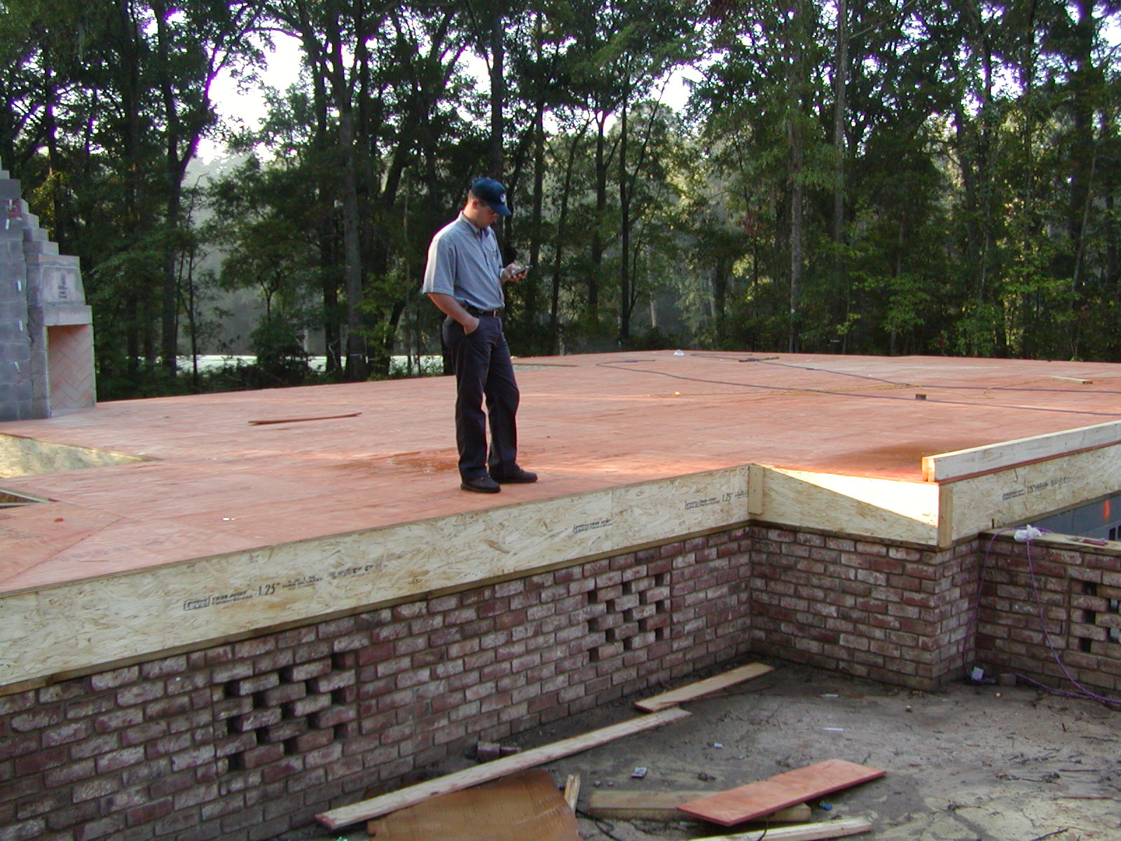 September 13, 2007 -- The plywood subfloor is installed on the floor system. The floor is being laid out today. You can see the sill plates standing on edge on the right edge of the photo. | ![]() |