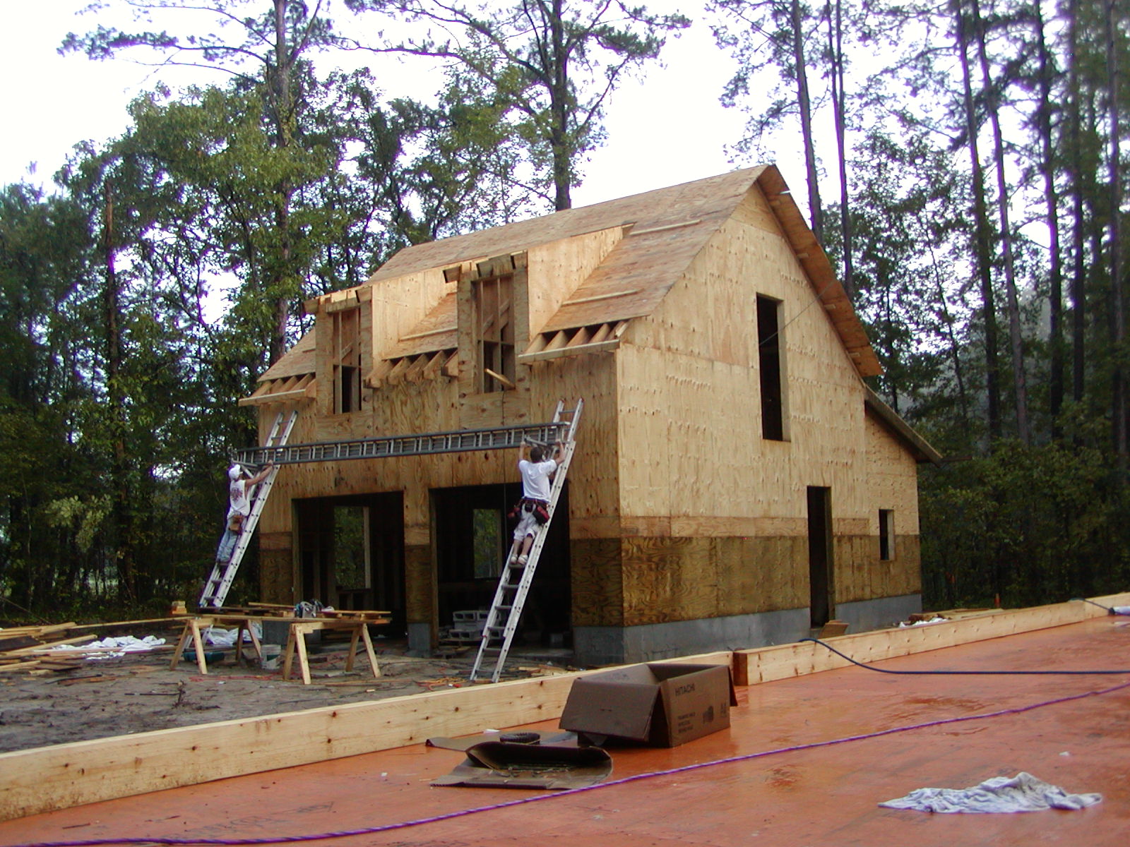 September 14, 2007 -- Plywood on the roof of the garage is nearly complete. Rain interrupted work last evening. The fly rafters have been installed on the workshop roof as can be seen. | ![]() |