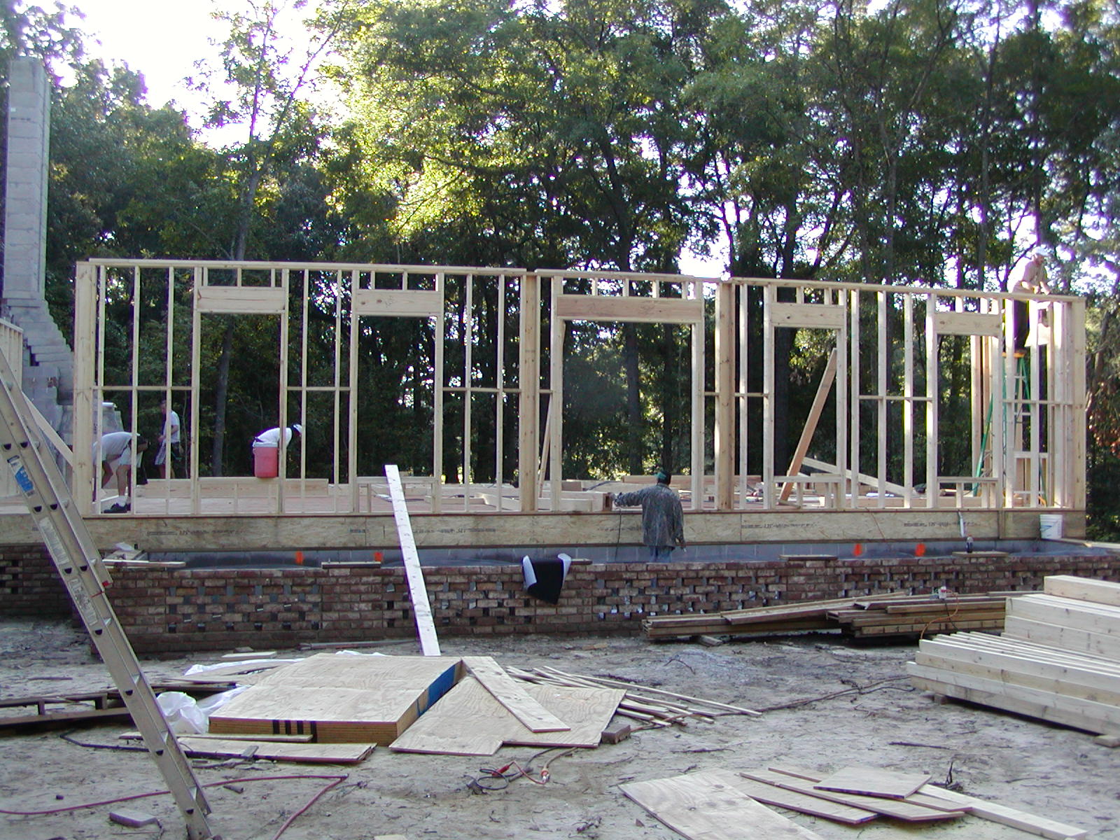 September 18, 2007 -- The first floor framing is being built. The front porch looks much lower than the house because the porch framing has not been built yet. | ![]() |