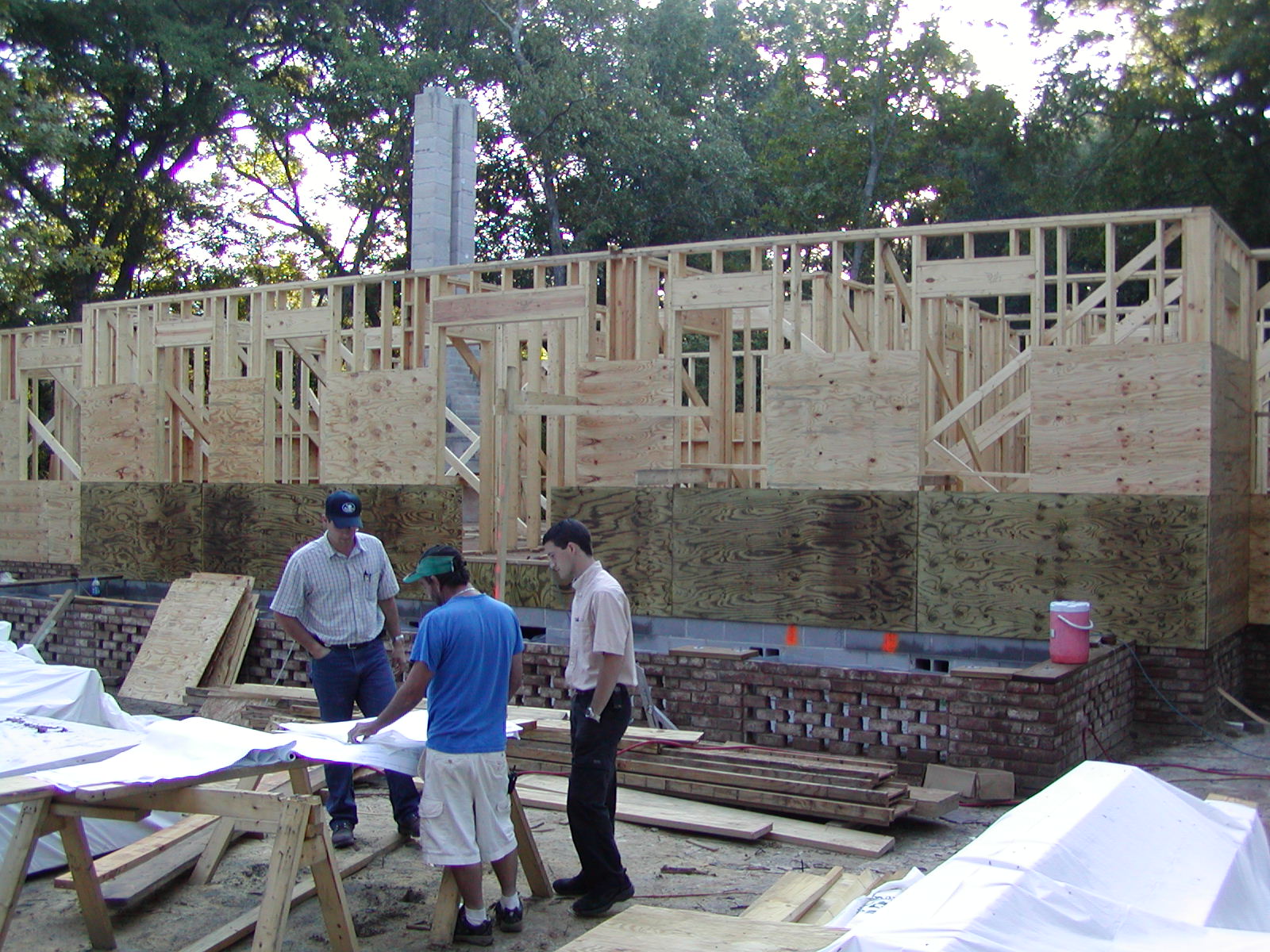 September 25, 2007 -- The first floor has plywood sheathing. The plywood is treated where the porches will be built. The top layer of plywood will tie the two stories together, so it cannot be installed yet. |