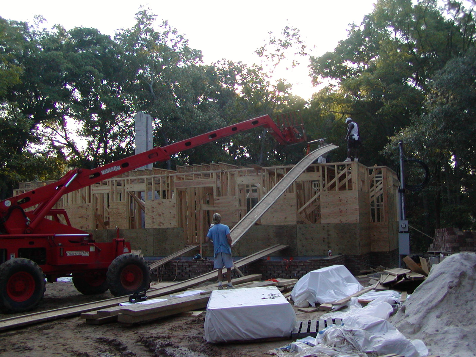 September 28, 2007 -- Long trusses that run from the front of the house to the back (with numerous supports underneath) are being lifted into place. | ![]() |