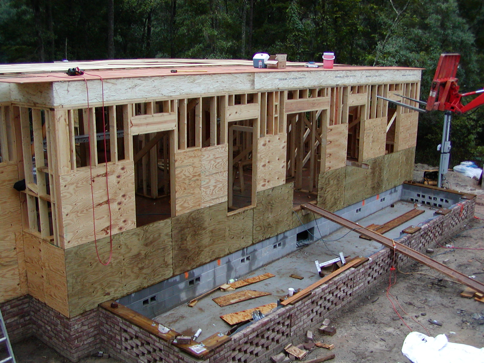 October 3, 2007 -- You can see where the front porch goes. Treated plywood sheathing is used where the porch contacts the house. The porch will be framed before long. | ![]() |