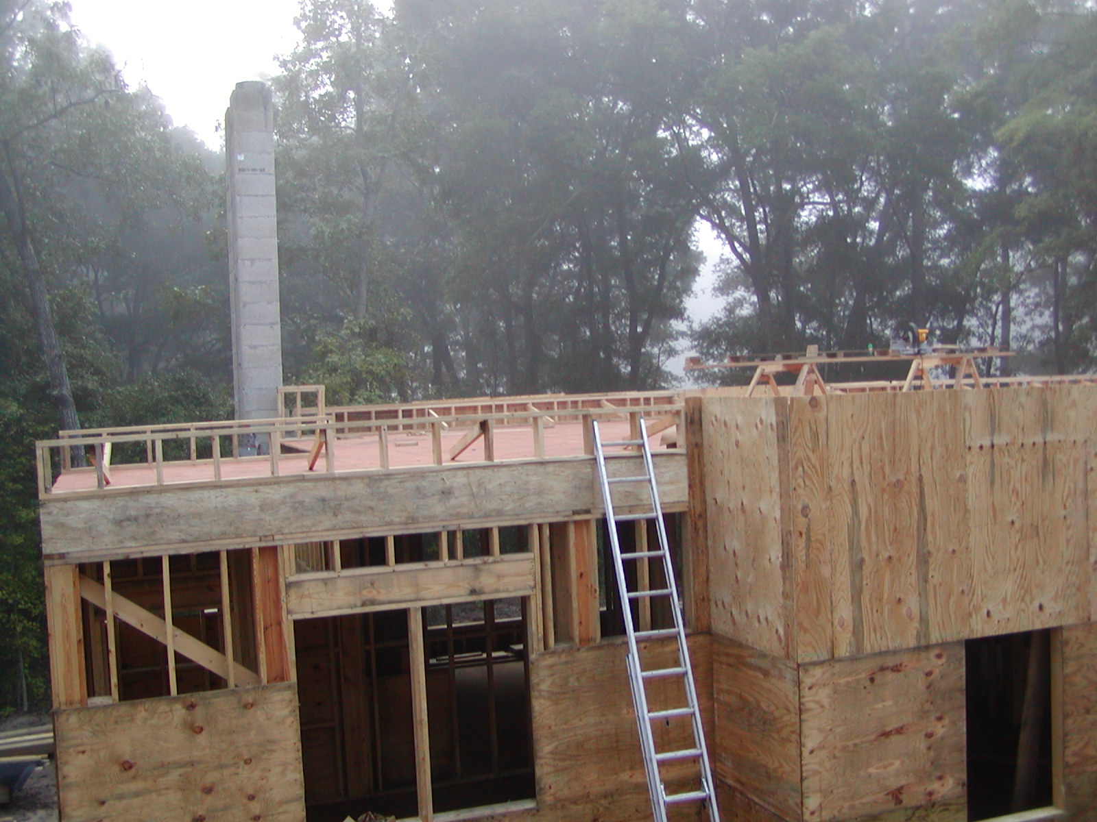 October 9, 2007 -- The knee walls are built and much of the plywood sheathing is in place. The second floor walls will be built soon. | ![]() |