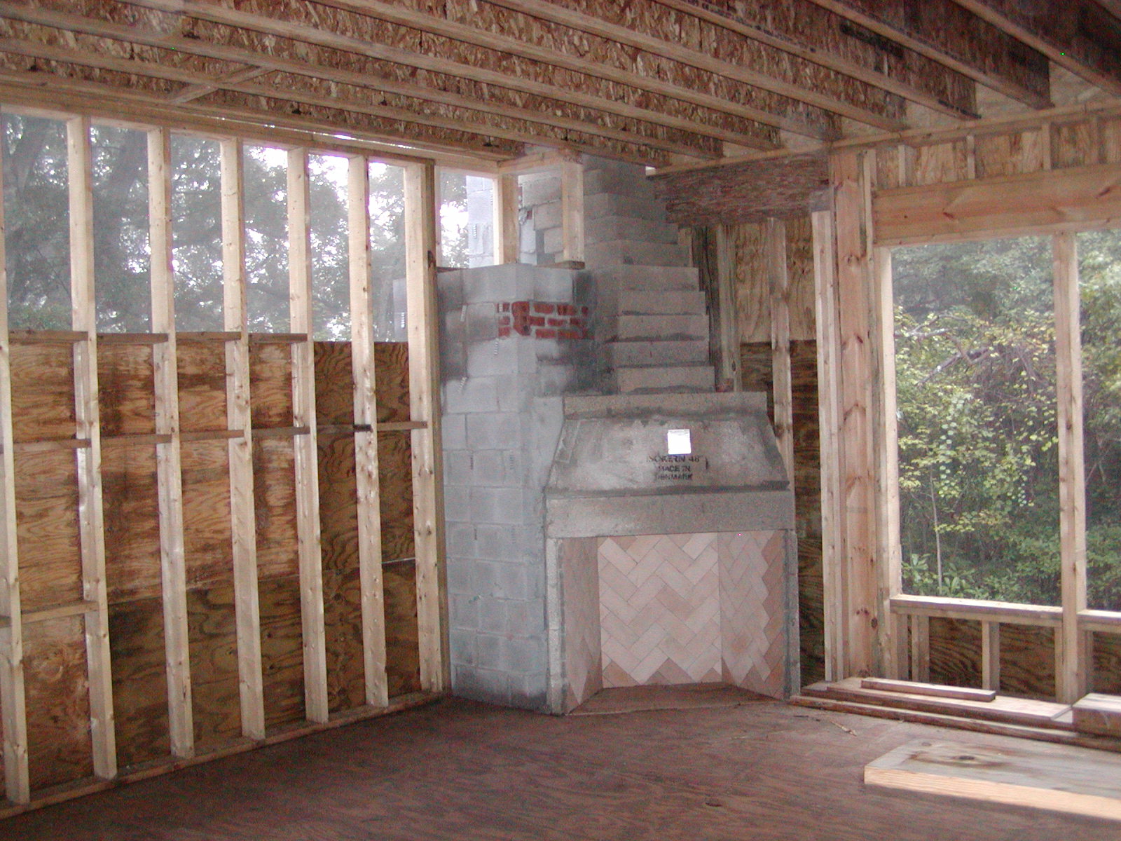October 9, 2007 -- The great room is shaping up. The openings to the right of the fireplace will be windows. The openings on the left are where plywood sheathing needs to be installed. | ![]() |