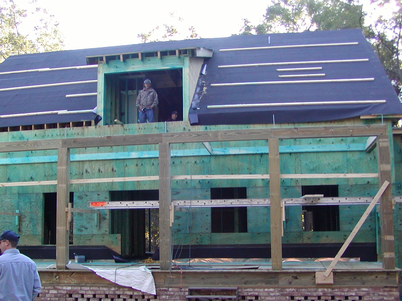 November 7, 2007 -- The front beam on the front porch is in place. The columns have hold down rods in them for hurricane protection. The green color on the sheathing is a mold and fungus killer as well as a termite protection. |