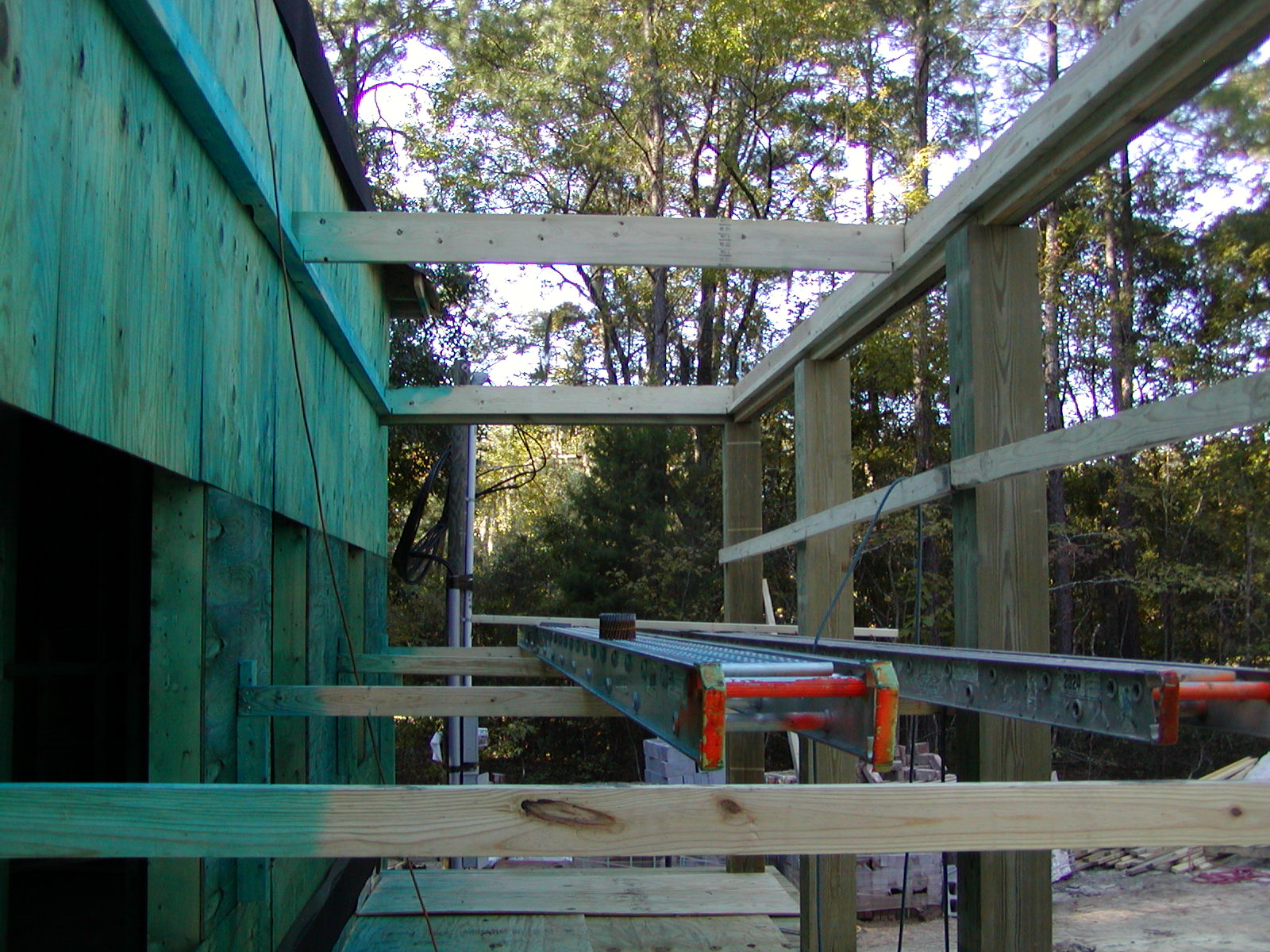 November 7, 2007 -- A couple of ceiling beams for the front porch are in place. The porch deck was covered with plywood to protect the deck from the mold and termite spray. | ![]() |