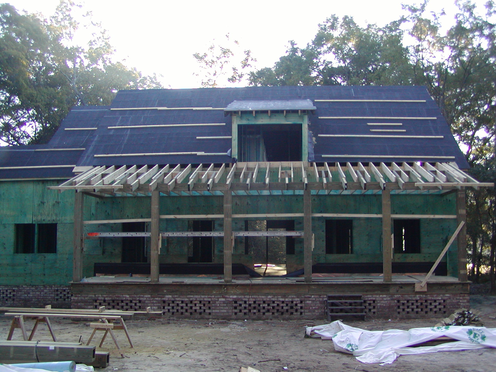 November 12, 2007 -- The front porch rafters are in place. Rafter tails are also installed and evenly spaced across the front. The columns each have a steel rod inside them for anchoring purposes. | ![]() |