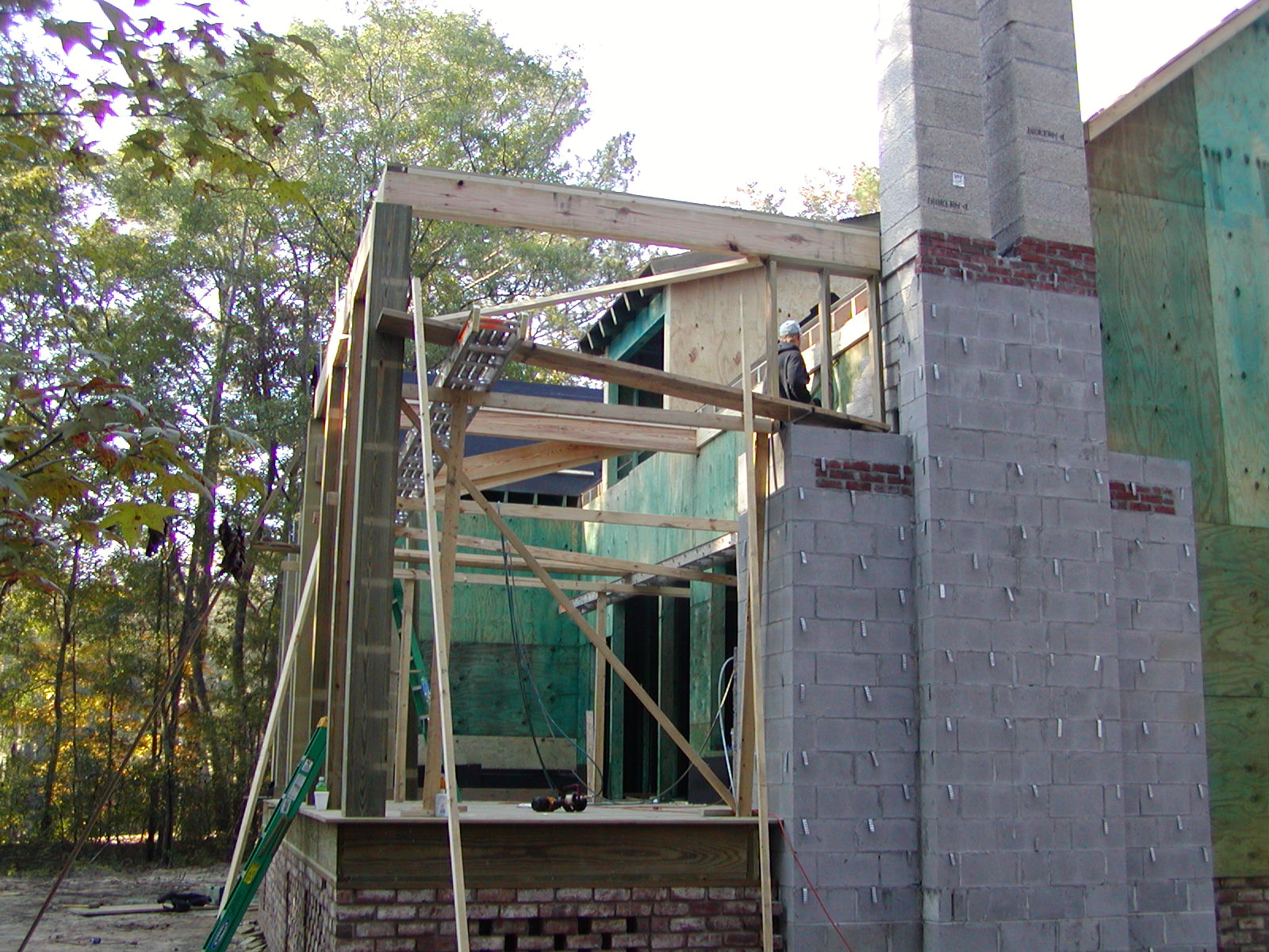November 14, 2007 -- Framing has begun on the screened back porch. It will have a gable roof to match the master bedroom and a shed roof between the two gables. | ![]() |