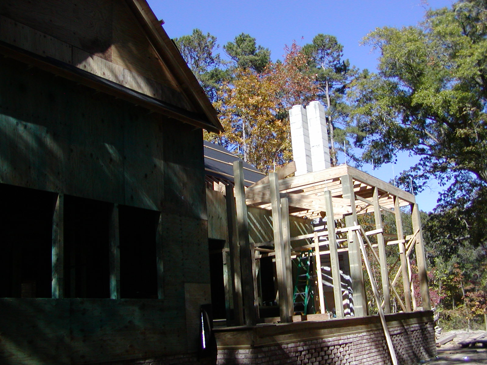 November 16, 2007 -- The rear porch roof is taking shape. The ceiling joists on the porch roof are in place. This will have a gable roof on it. | ![]() |