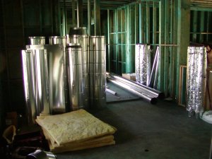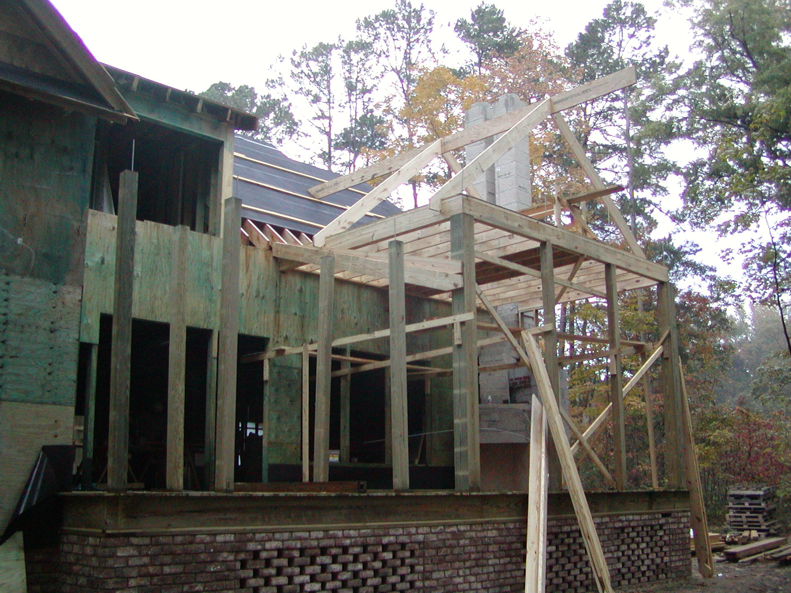 November 19, 2007 -- The rear porch roof is being framed. It will have a gable similiar to the master bedroom. A shed roof will be built between the two gable roofs. | ![]() |