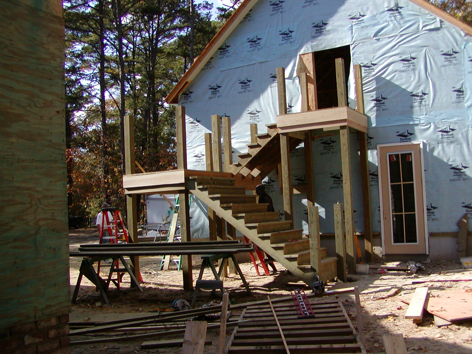 November 21, 2007 -- The permanent stairs to the garage apartment are being built. They are four feet wide inside the hand rails. The service yard for the garage will be under the intermediate landing. |