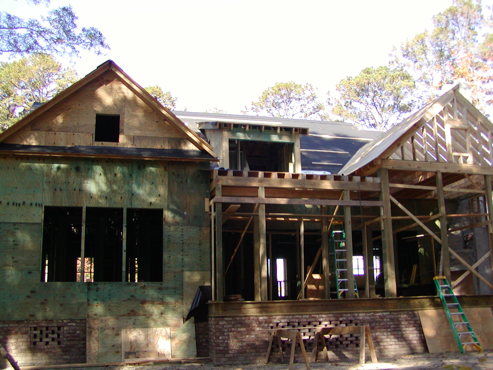 November 23, 2007 -- The rear porch is getting plywood sheathing on the roof. The shed roof between the two gables also has plywood. | ![]() |