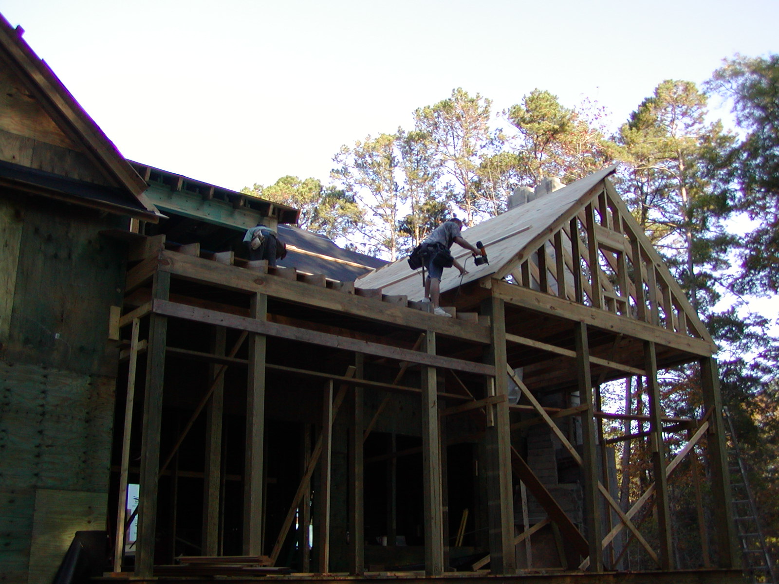 November 27, 2007 -- Plywood roof sheathing is being completed on the back porch. It will be finished today. A house plywood nailing inspection is planned for tomorrow. | ![]() |