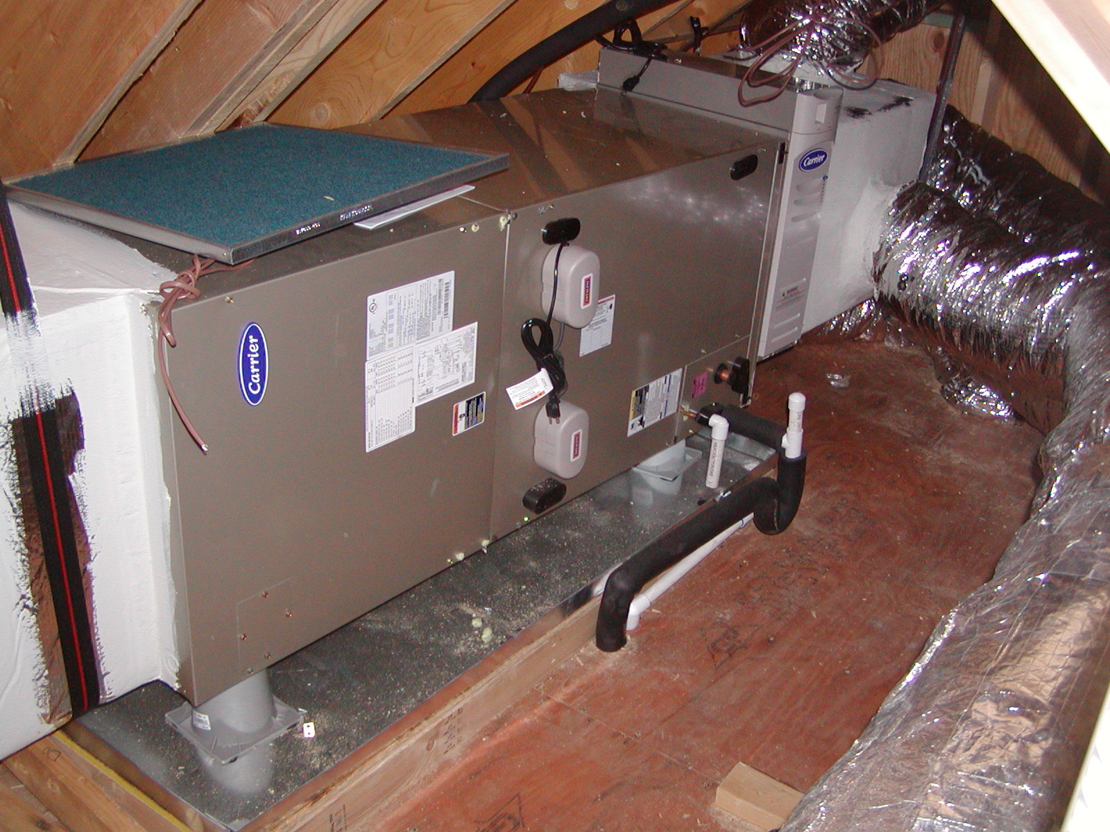 December 5, 2007 -- The HVAC air handlers are installed in the attic. This unit is for downstairs. It has both electrostatic and UV filters for clean air. | ![]() |