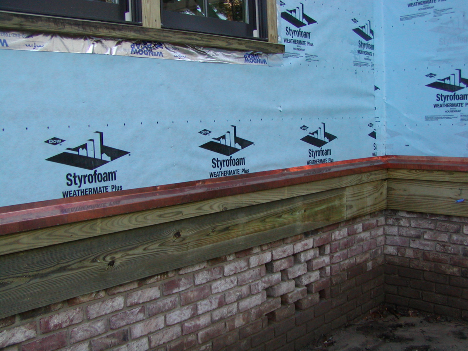 December 31, 2007 -- Copper flashing is installed above the drip rail. Concrete siding board will be installed above the flashing. | ![]() |