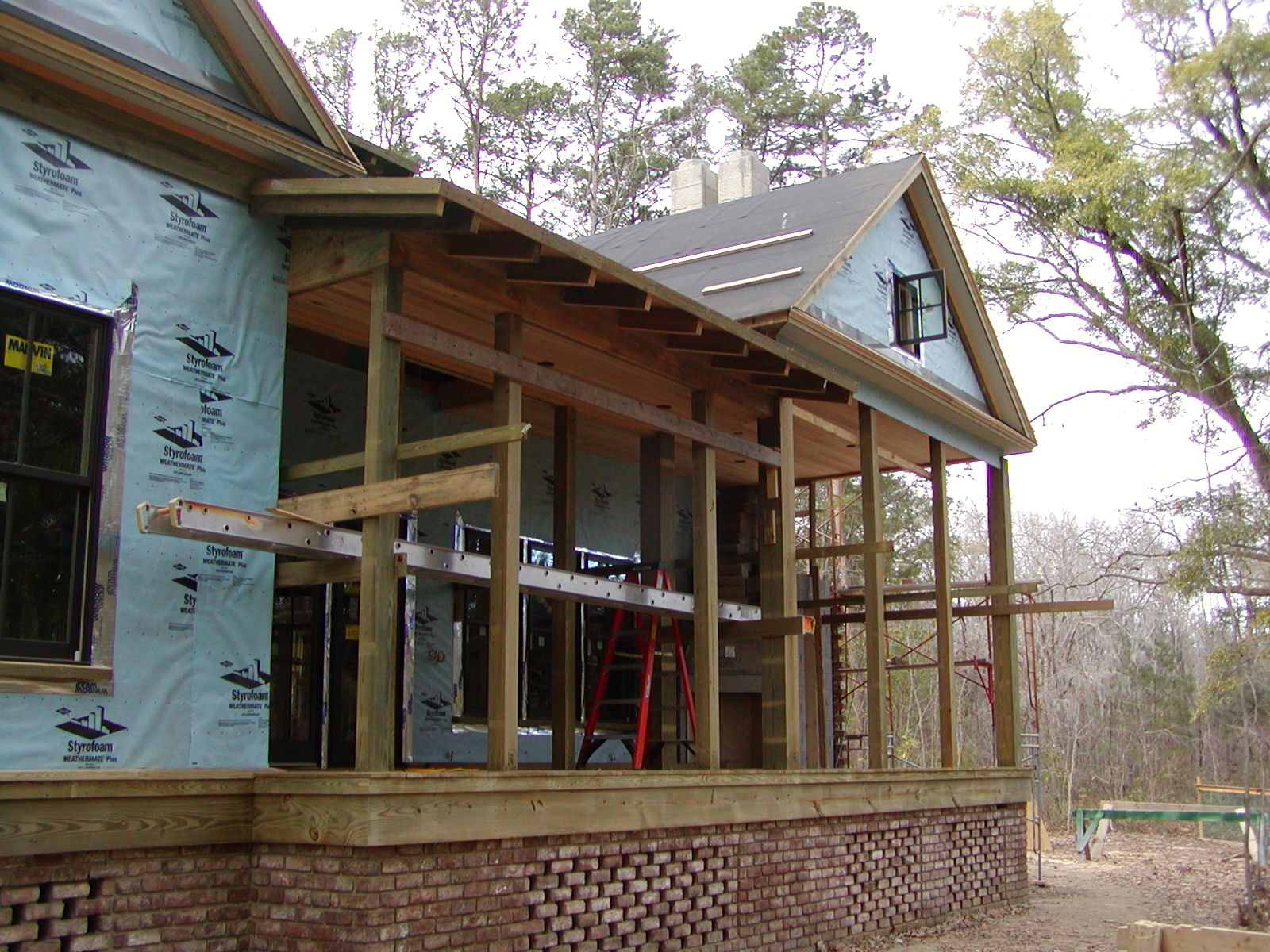 January 8, 2008 -- The rear porch is nearly complete with columns, beams, and v-groove ceiling. | ![]() |