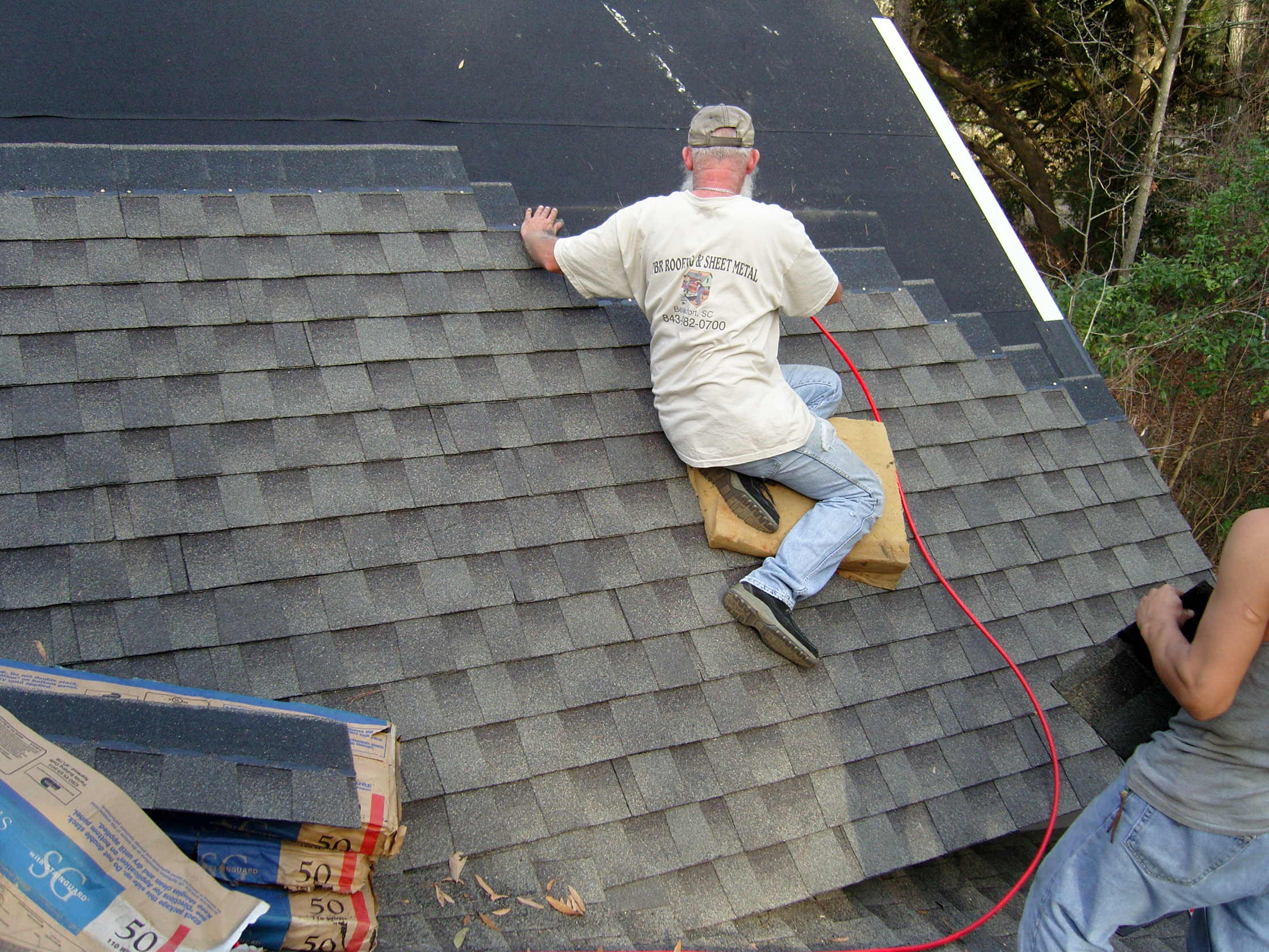 January 10, 2008 -- Roofers are now working on the gable above the screened porch. | ![]() |
