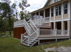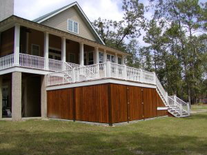 The Causey House has a two level deck in the rear. Storage for outdoor equipment is provided under the upper level deck. This beautiful home features a steel roof, Hardie Plank siding, stucco piers and very nice exterior trim. It has spray in roof insulation resulting in affordable energy bills. The porches allow for relaxation during the beautiful evenings in South Carolina Low Country. Ponds & Sons builds not only superior homes, but also very nice looking, rugged decks. |