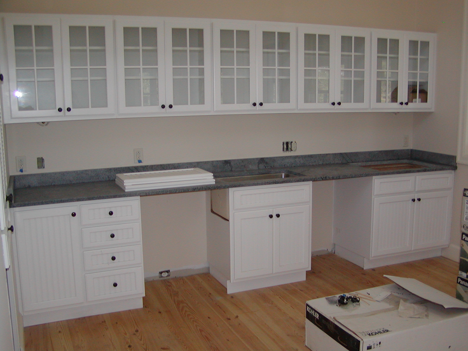 September 27, 2007 -- The soapstone counter tops have been installed. A cook top goes in the opening on the far right. An undercounter refrigerator goes to the right of the sink and a dishwasher to the left. |