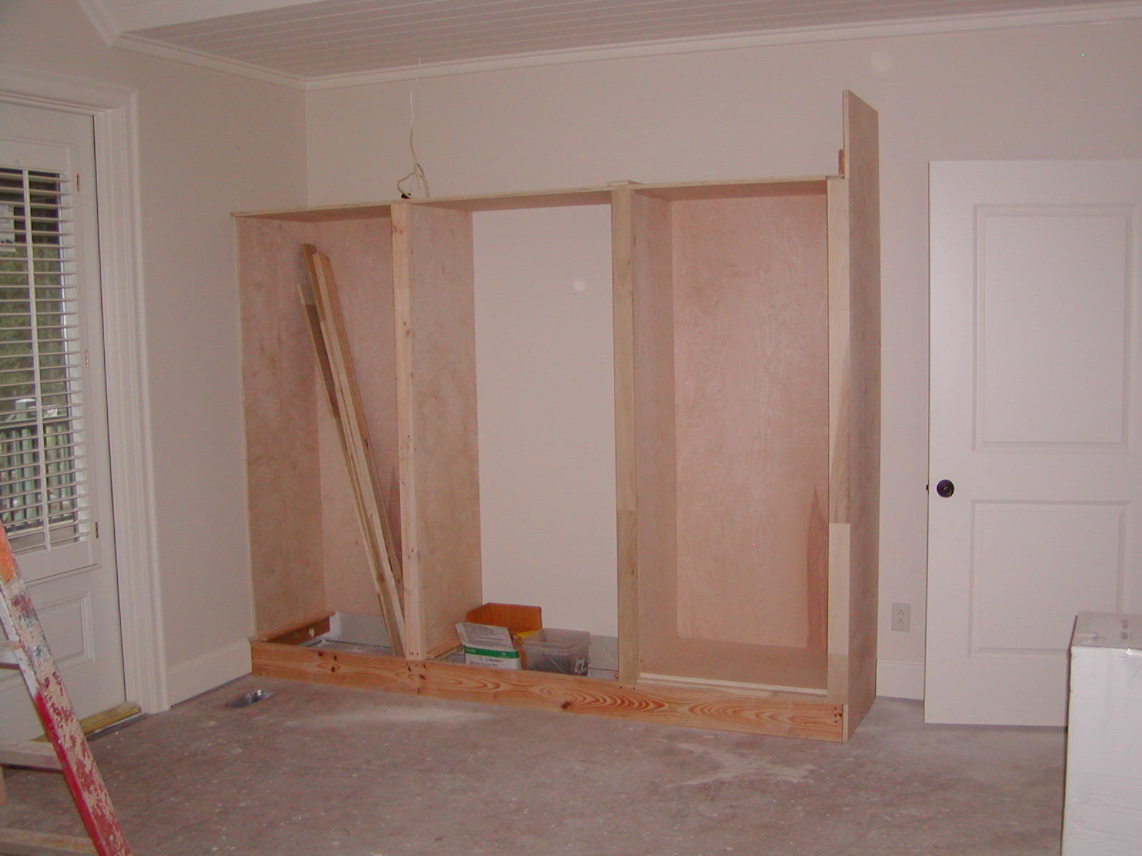 October 22, 2007 -- The master bedroom cabinet is being built. It will have space to hang clothes and shelves for other items. The cabinet will be painted. | ![]() |
