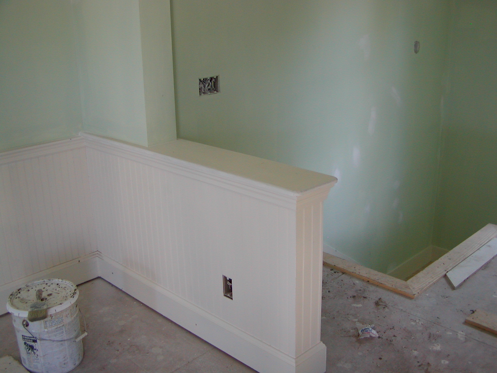 September 26, 2007 -- The divider is being trimmed. Wood trim has been installed around the stair well. Final painting is being done. The floor will have carpet. | ![]() |