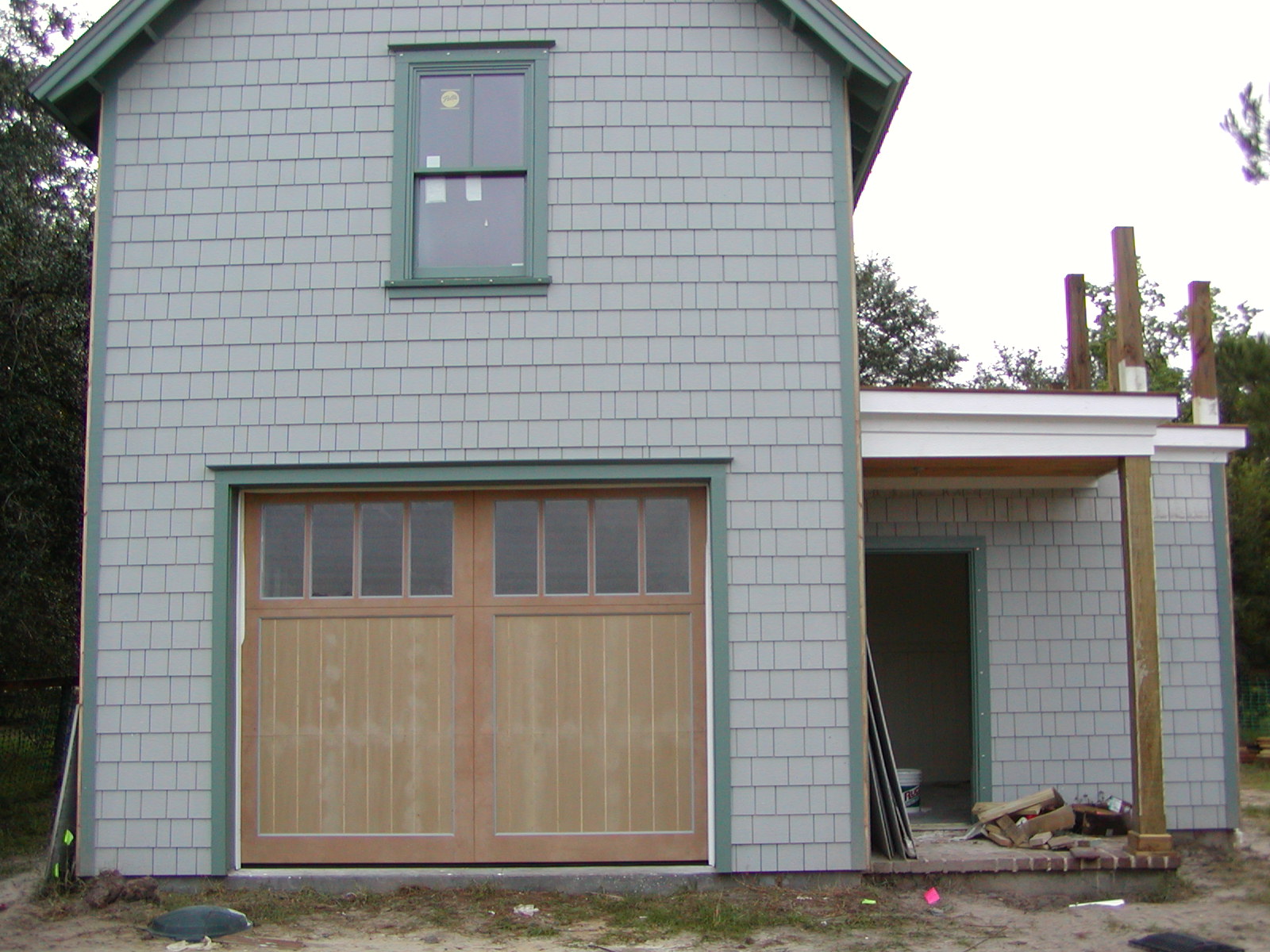 October 5, 2007 -- The overhead garage door has been installed. It has not been painted yet. The column supporting the upstairs deck is also in place. | ![]() |