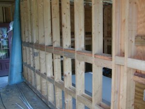 August 1, 2007 -- The walls of the garage now have blocking for the wainscot. It will be installed in a day or so.
