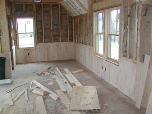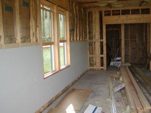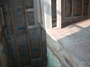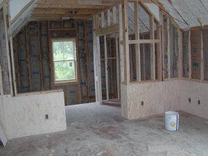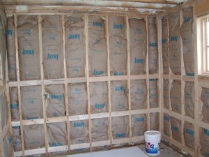 August 2, 2007 -- Fiberglass insulation is being installed in the walls. Sound insulation will be installed around the bath room upstairs. This will complete the insulation.