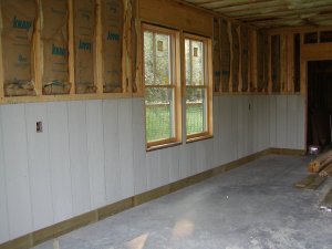 August 9, 2007 -- The second layer of cement board is now installed. The vertical boards make it look very much like T-111 suitable for garages (non flammable).