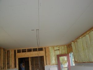 August 17, 2007 -- 5/8" thich sheet rock was hung downstairs in the garage. The wires in the ceiling are for the garage door opener.