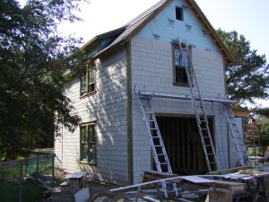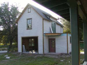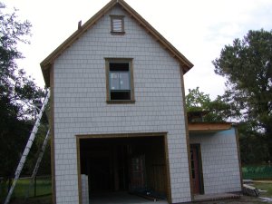 June 13, 2007 -- This is Gitlitz Garage from the road. The siding and trim are on, but not painted. The fence in front will come down as soon as construction is complete.