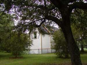 June 20, 2007 -- This is a view of the garage from the house. The dark triangle in the upper right corner is the front porch roof of the Cottage.