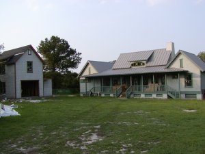 June 18, 2007 -- The garage roof does not show up well because it is still the black ice and water shield. This week, steel roofing (like the cottage) will be installed.