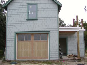 October 5, 2007 -- The overhead garage door has been installed. It has not been painted yet. The column supporting the upstairs deck is also in place.