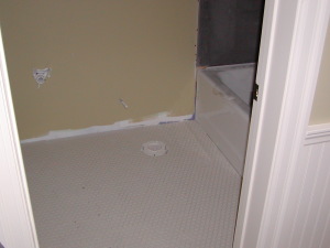 October 22, 2007 -- The bathroom floor has been tiled. It matches the tile in the house bathrooms. In the next day or so, the walls will be tiled.