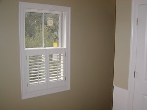October 22, 2007 -- The windows have plantation shutters mounted over the lower sash. The shutters open and close and even open like doors. Notice the hinges.