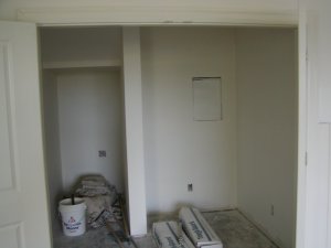 September 13, 2007 -- There is a nice storage area under the stairway. The box on the right is the breaker box. Right now, it is masked for painting.