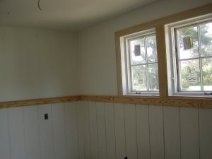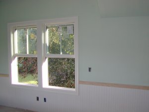 September 13, 2007 -- Upstairs, the windows are painted. Chair rail is being installed between the sheet rock and wainscot. The walls have their first coat of paint.