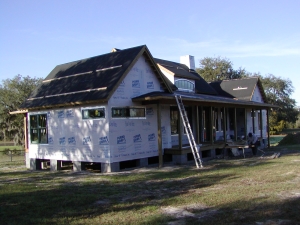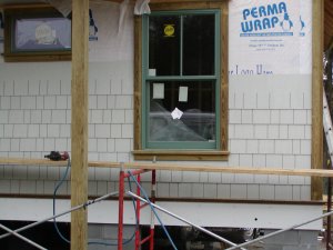 January 24, 2007 -- Windows and corners are trimmed. A set of steps will also be built on the left end of the front porch shown on the right edge of the photo.