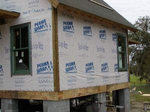 January 24, 2007 -- A view of the home. Notice the exterior trim on the window and corners. The skirt board is up and siding is started.