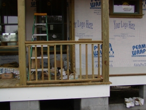 January 24, 2007 -- Railings are going up on the front porch. Steps will go down to the right.