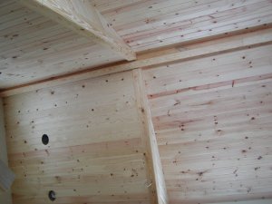 July 19, 2007 -- Each set of beams on the roof gets a cross beam like this one. It will also have a beam from the ridge beam to the center of the cross beam.